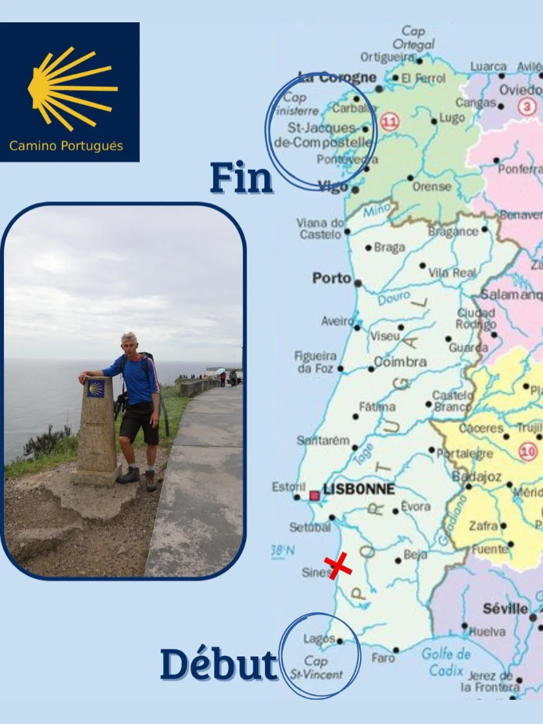 🥾 Comme vous savez, il est parti de Cap Saint Vincent et va traverser le Portugal pour atteindre Saint Jacques de Compostelle en Espagne… le tout à pied ! Un vrai challenge qu’il fait en notre honneur. Il a très bien démarré et se trouve pas loin de Sines (voir le ❌ sur la carte).
